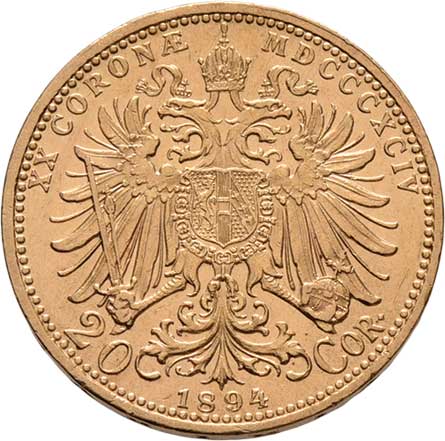 61. 20 Koruna 1894 KB, 6.772g, nep.hr., dr.rysky, pěkná