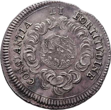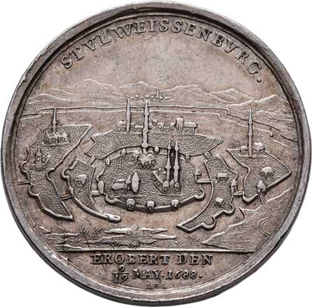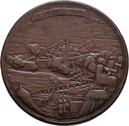pohled na obležené opevněné město, nápis na stuze / 9-řádkový nápis, měď 36mm, 16.483g, M.954, patina R! |
