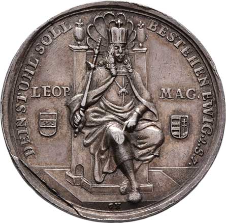 1688 - sedící Leopold I., znaky, písmo / pohled na město, nápis, Sign., Ag 30mm, 9.198g, pěkná pat. RR! |