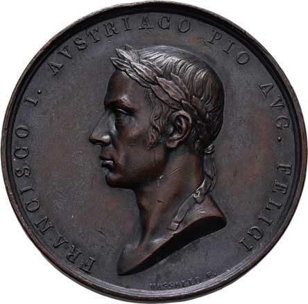 poprsí zleva, opis / Lombardie zdraví císaře, písmo, Sign., měď 43mm, 35.097g, H.3437(Ag), hr., rys., pat. |