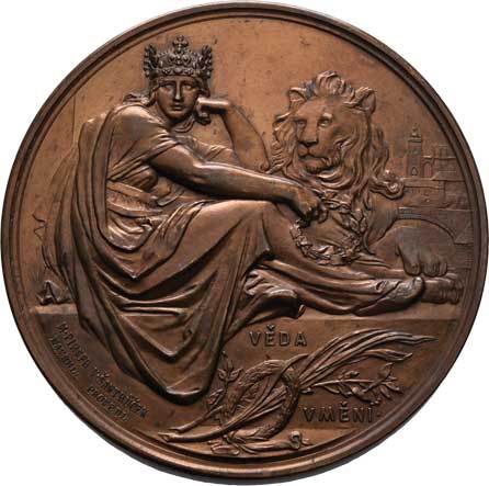 - poprsí zprava, dvojitý český opis / sedící Čechie, lev, ratolest, nápis, Sign., bronz 65mm, 127.903g |