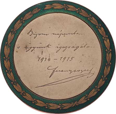 poprsí zleva, maďarský nápis / faksimile rukopisu, bronz v zeleně smalt. mezikruží 65mm, 105.276g, rysky |