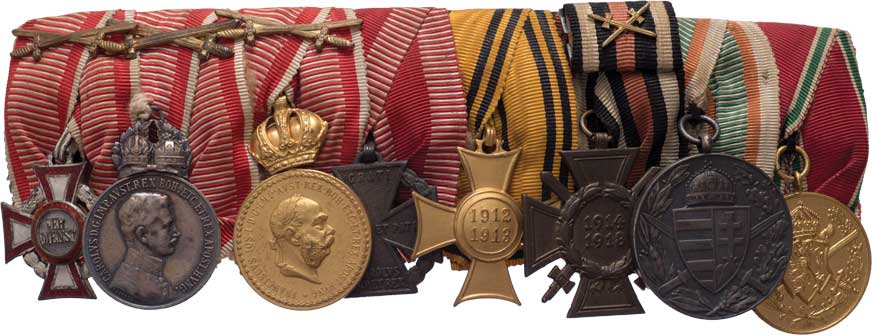 kříž, 2x Signum Laudis, Karlův kříž, Mobilizační kříž, Něm.válečný kříž s meči a dvě pamětní medaile |