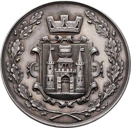 znak a opis / městská brána, věnec a opis, Sign. Schwertner, Ag900, 37mm, 28.027, dr.hr., vlas.rysky |