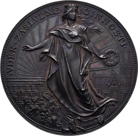 zprava, nápis/ pohled na město, nápis, orlice a terč, Sign.Korschan, patinované Ag990, 31x42 mm, 26.151g |