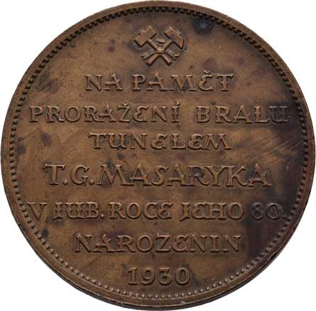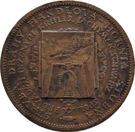 portál tunelu v krajině, dvojitý opis / 7-řádk.nápis, hornická kladívka, Nesign., bronz 40mm, dr.hr., skvr. |