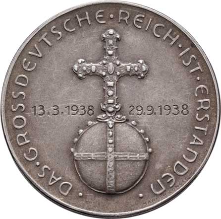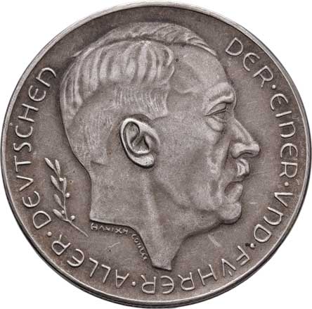 hlava A.Hitlera zprava, opis / říšské jablko, písmo, Sign., patin. Ag835, 36mm, 21.486g, nep.rysky, téměř |