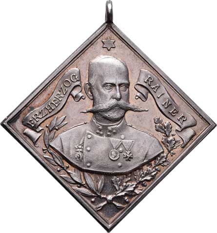 Rainera zpředu, nápis a věnec / znaky pod korunou, nápis na stuze, Ag 35x35 mm, 24.352g, původní ouško |