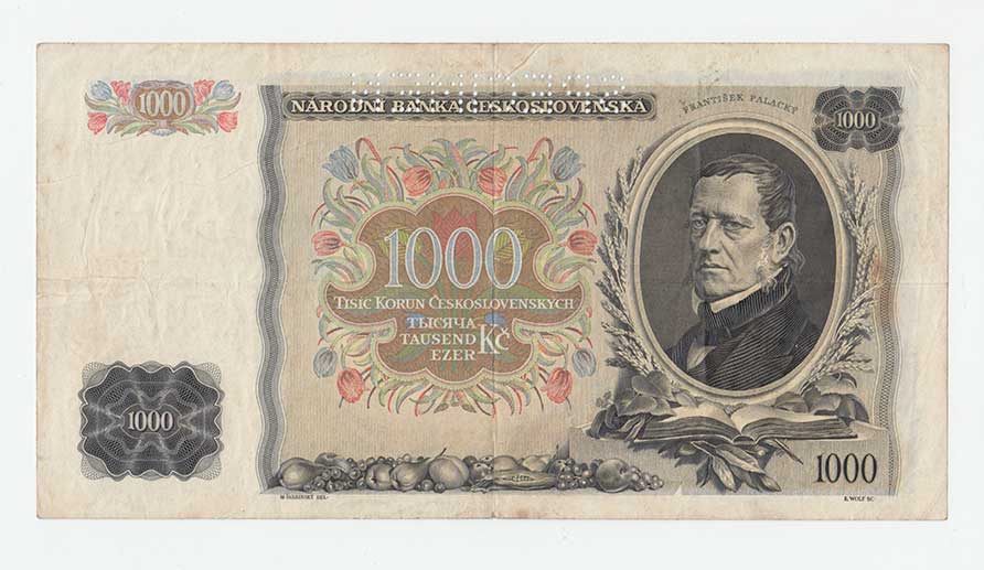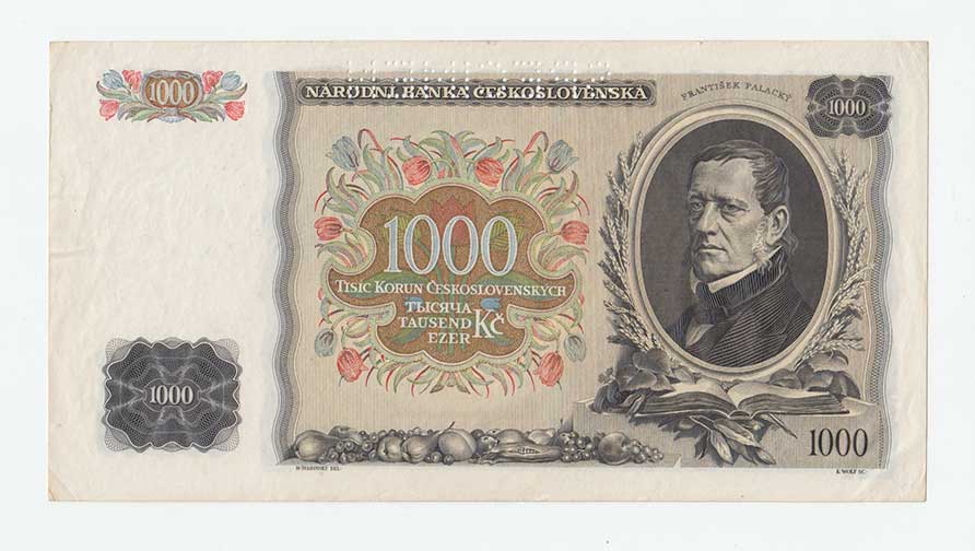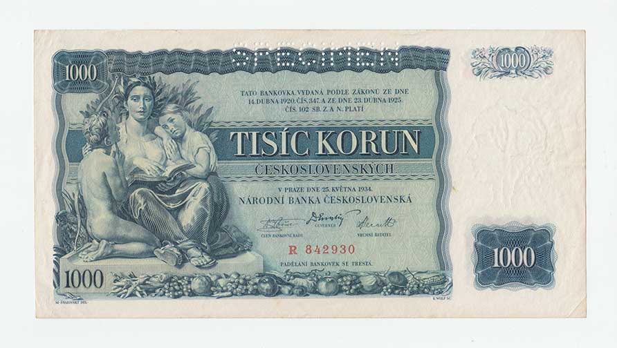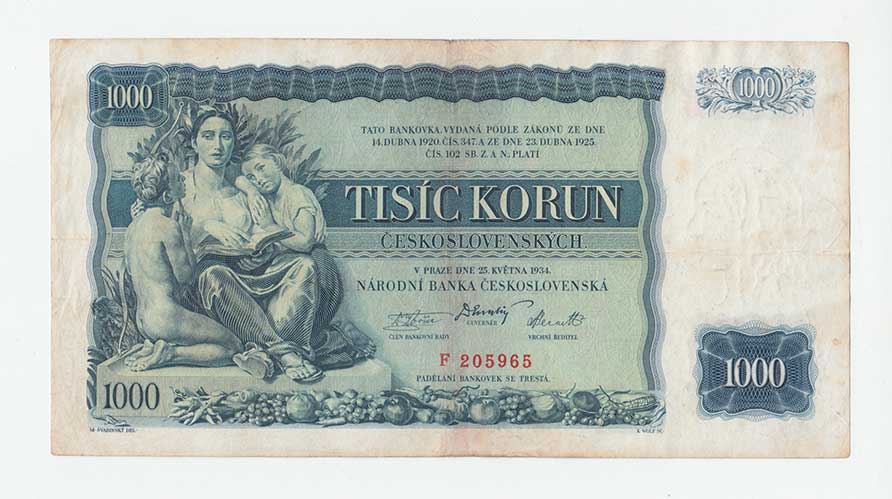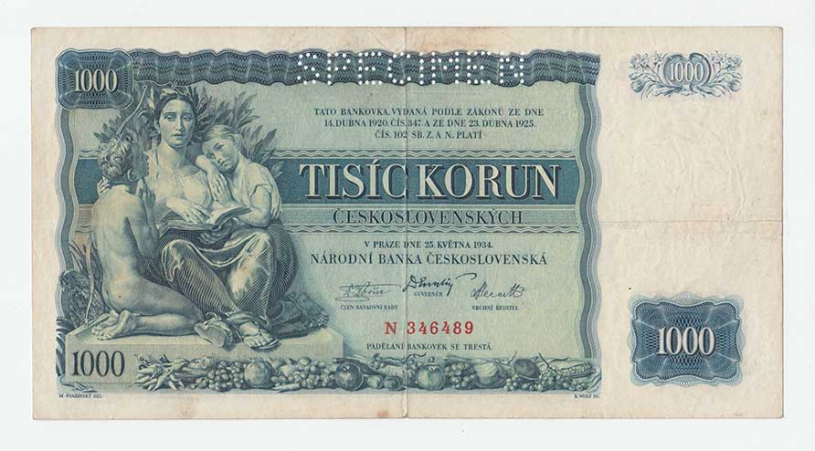 | 3165. | 1000 Koruna 1934, série F, BHK.27, He.27a, "neperf." | 3 | 800,- | 1200,- |
