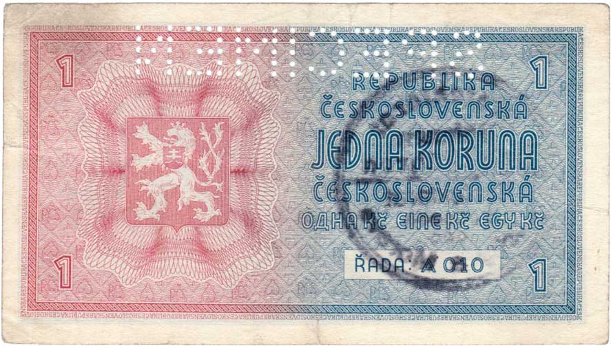 | 3176. | 1 Koruna b.l. - ruční přetisk, série A010, BHK.28a,