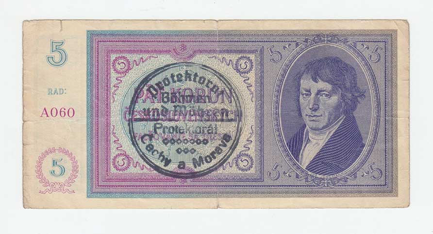 | 3183. | 5 Koruna b.l. - ruční přetisk, série A060, BHK.29a,