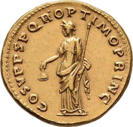 | 5. | Aureus, Rv:"COS.V.P.P.S.P.Q.R.OPTIMO.PRINC.", stojící