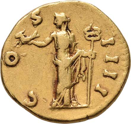 | 6. | Aureus, Rv:"COS.IIII.", Felicitas drží kozoroha a