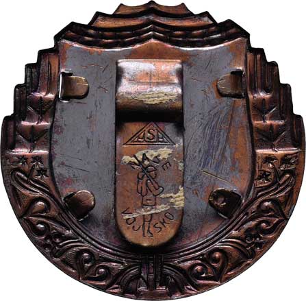 černě lakovaná mosaz 33x57 mm s upínací patkou, ex ČNS Praha - aukce 68/1854 |