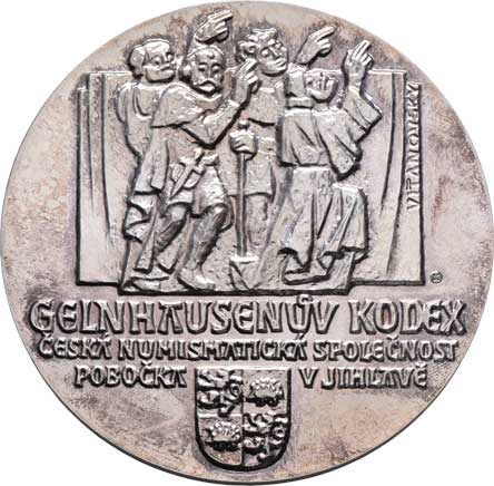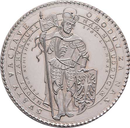 znaky, opis / panovník klečí před sv. Václavem, Karolinum, opisy, Sign., Punc., Ag900, 38mm, 24.360g |
