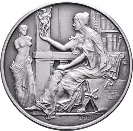 - dvě alegorické postavy, pohled na město, nápis, Sign., patinovaný bronz 58x72 mm, škr., skvrnky |