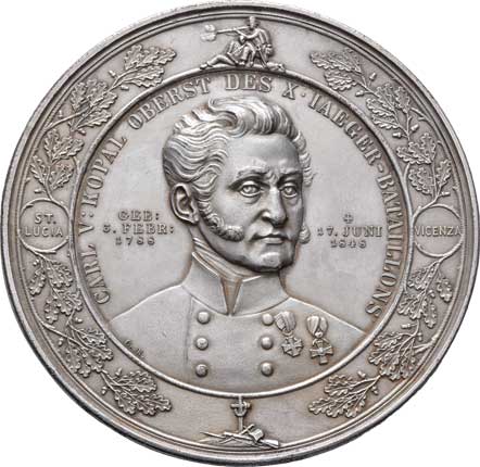 - poprsí čelně, dubový věnec, písmo / pomník, znak, písmo, Sign., postř.měď 64mm, 114.533g, nep.hr., tém. |