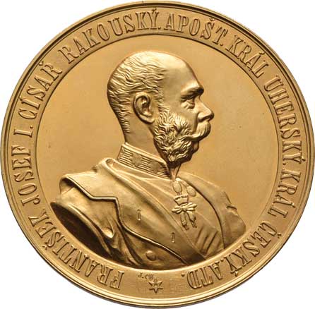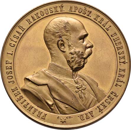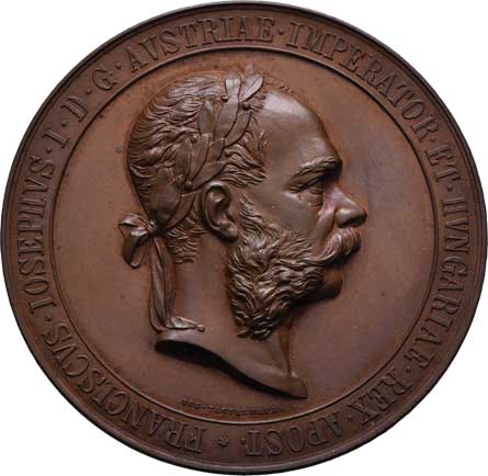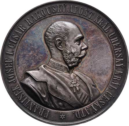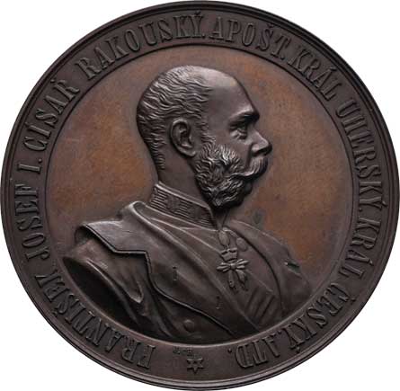 hlava Fr.Josefa zprava, opis / alegorie a dvojitý opis, Sign., bronz 57mm, 71.032g, ŠFP.1b, patina |