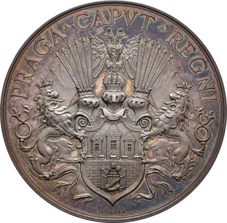 kráčející Čechie se lvem, opis / znak Prahy a opis, Sign., Ag800, 60mm, 89.070g, ŠFP.7a, uděleno 64ks R! |