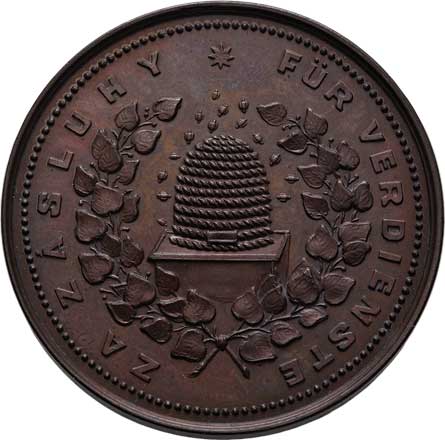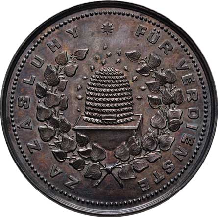 lev, dva opis / úl a včely, věnec a opis, Sign., bronz 40mm, 28.842g (uděleno 9 ks), krásná patina RR! |