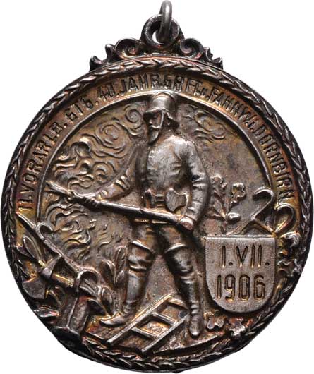 palác / hasičské nástroje, písmo, Nesign., cín 39 mm s raženým ouškem, ŠFP.22c, 22.487g, nep.hr., pat. RR! |