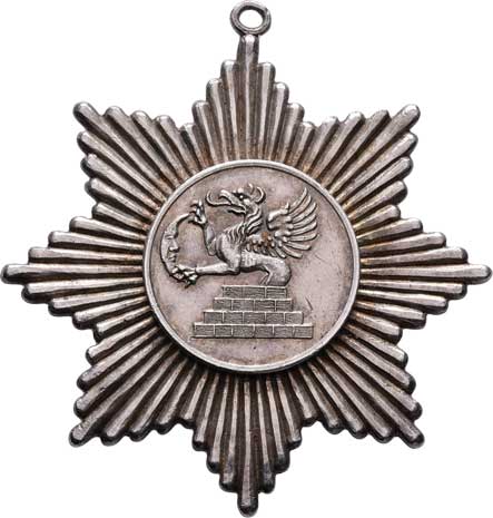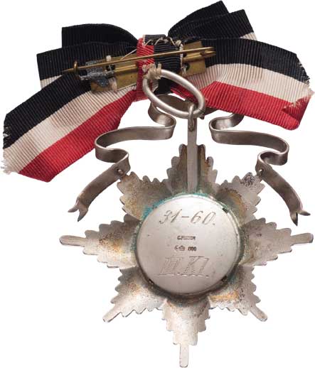 31-60 (patrně cena za III.místo), hvězda 60 mm, Punc. Ag800, se závěsem a stužkou, 33.270g, skvr., pat. RR! |