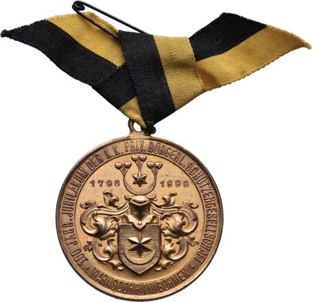 znak města, německý nápis / terč, pušky, prapory, pohár a opis, Nesign., Punc., 34x34 mm, 28.684g, etue |