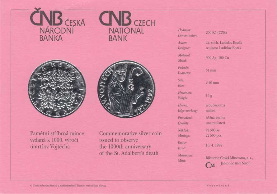 | 1706. | 200 Koruna 1997 - 1000 let úmrtí svatého Vojtěcha,