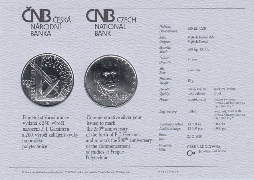 | 1710. | 200 Koruna 2006 - František J. Gerstner / Pražská