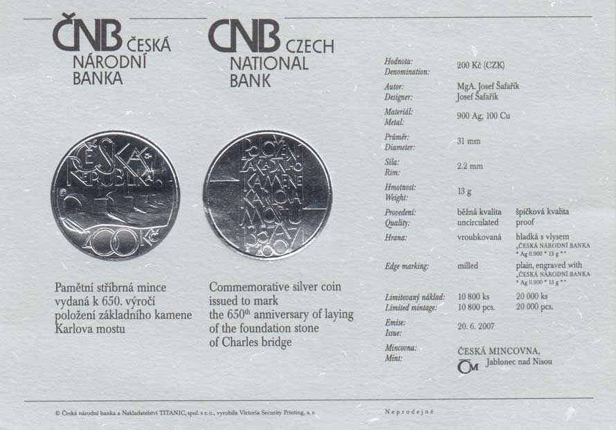| 1714. | 200 Koruna 2007 - 650 let založení Karlova mostu,