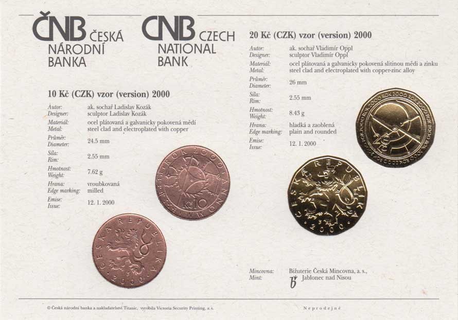 50 Haléřů - 50 Korun, návrhy mincí 1 Cent - 2 Eura s českými motivy, celkem 15ks |