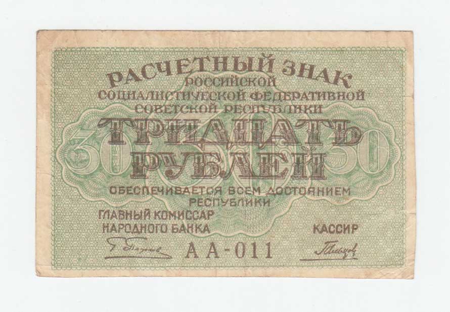 | 3705. | 30 Rubl (1919), Pick.99a - Sign. Pjatakov / Gusjev | 3 | 10,- | 46,- |