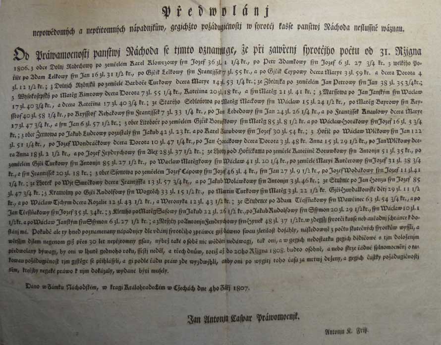 | 3808. | Náchod 31.X.1807 - Svolání nápadníků sirotčí pokladny