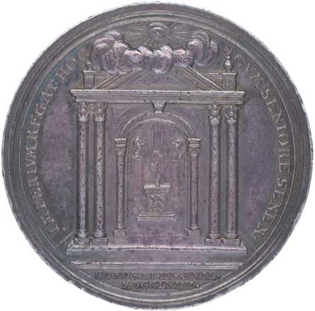 Poprí Marie Terezie se závojem zleva, dole vročení a signatura, opis / na oltáři orel s roztaženými křídly, vlevo palma, vpravo vavřín s trofejemi, nahože zářící slunce, opis, Bronz (litý) 86 mm, 138,90 g Nov.XIII/G-15b, SH.1374, We.7860 RR! |