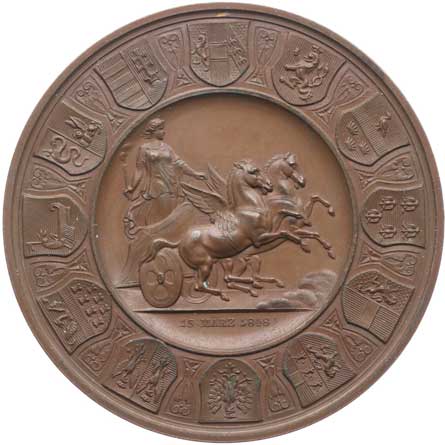 Poprsí čelně, 5řádk.nápis / čtyři vročení, korunovaný knížecí znak Sign., Bronz.plaketa 46x56 mm |