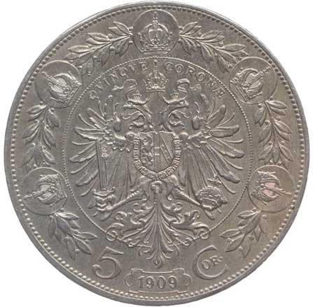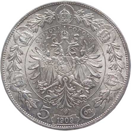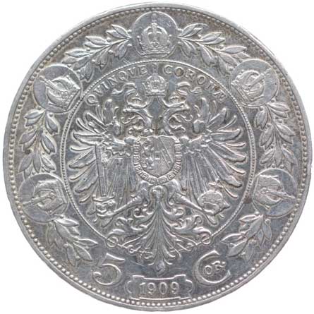 | 1209. | 5 Koruna 1909 b.zn. Schwartz | tém.0/0 | 1000,- | --.- |