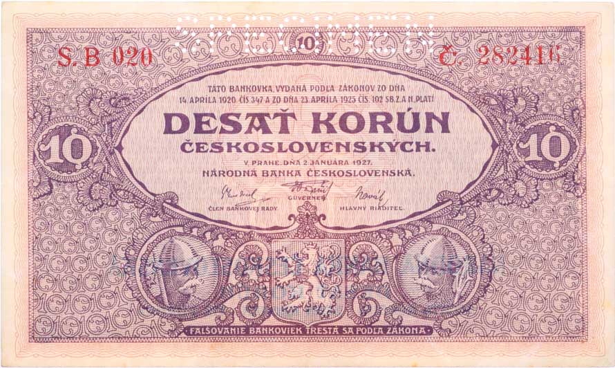 | 1295. | 10 Kč 1927, série B020, B.22c, Hejz.22bS1 "SPECIMEN" | 0 | 500,- | 750,- |