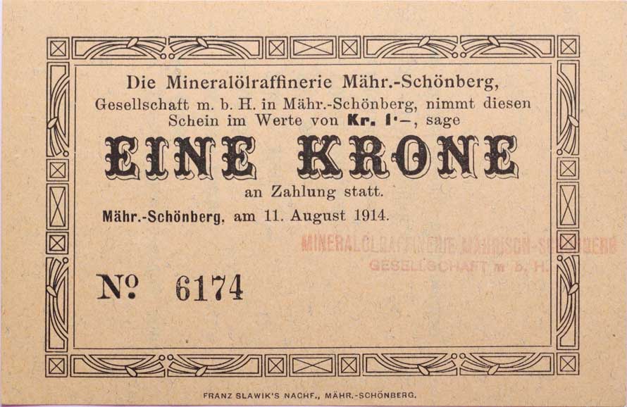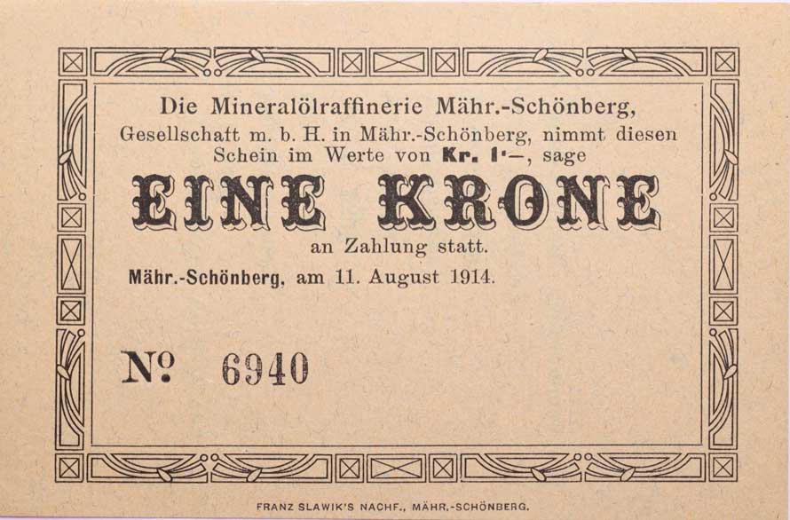 | 3414. | Šumperk (M.Schönberg), mineral.raf., 1 Krone 11.8.1914, č.6940,