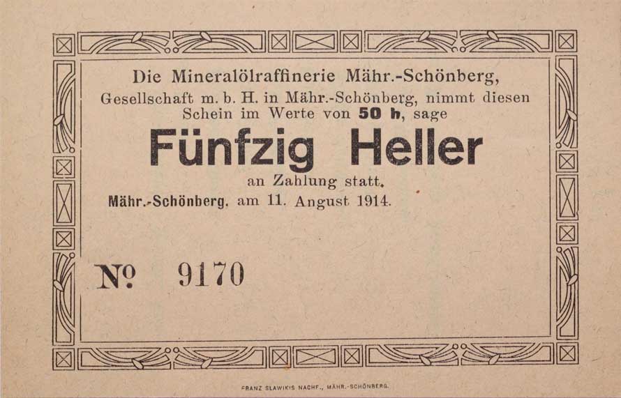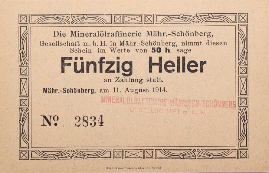 | 3407. | Šumperk (M.Schönberg) mineral.raf., 50 Heller 11.8.1914, č.9170