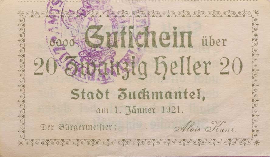 | 3436. | Zlaté Hory (Zuckmantel) - 20 Heller 1.1.1921, DH.240.1.2a | 1- | 320,- | 1300,- |