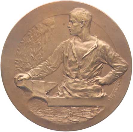 Dvě stojící alegorické postavy / 5řádk.nápis a opis ve věnci Sign., Pozlac.bronz 58 mm |