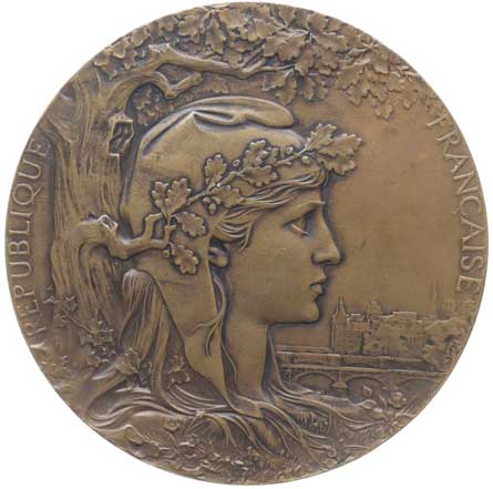 Pod stromem hlava Marianny zprava / dvě vznášející se alegorické postavy, opis, Sign., Bronz 64 mm |
