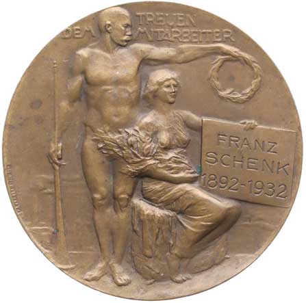 Stojící mužská a sedící ženská postava s nápisem Franz Schenk 1892 - 1932 / pohled na panorama města, opis, Sign.P.Breithut, Bronz 66 mm |
