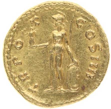 1. AV Quinar, Rv:"TR POT COS IIII" stojící Minerva ve zbroji zleva