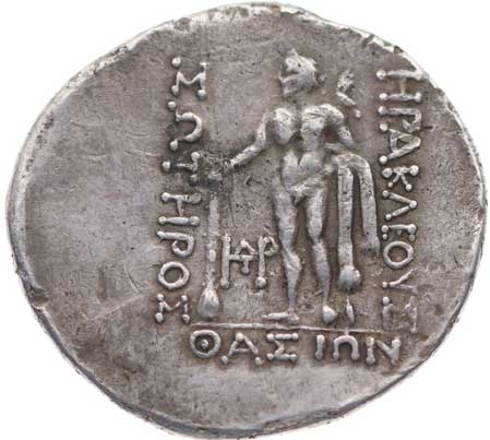91. AR tetradrachma, Dionýsos zprava / stojící Heracles zleva