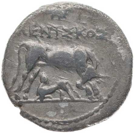 92. AR drachma, Kráva s teletem zprava, hlava Isis, nápis "MENISKOS"