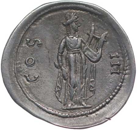 127. AR Denár, Rv:"P.M.TR.P.III.COS.II.P.P", sedící Apollo