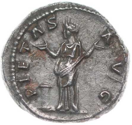 120. AR Denár, Rv:"PIETAS.AVGVSTI.", stojící Pietas čelně