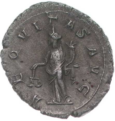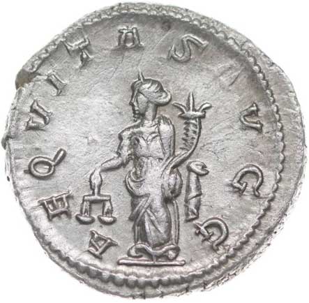 106. AR Antoninianus, Rv:"AEQUITAS AVG.", stojící Aequitas zleva