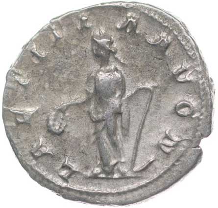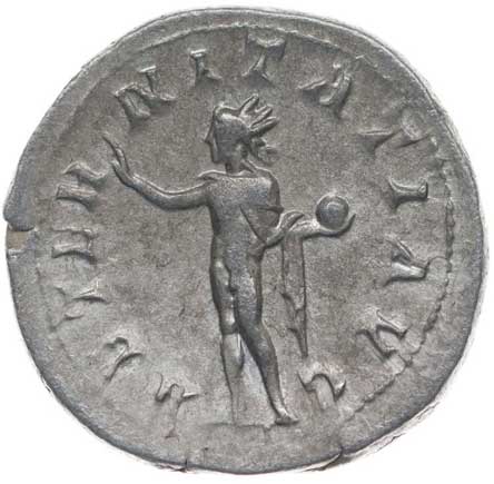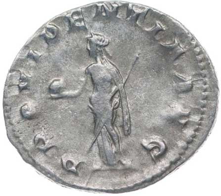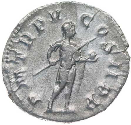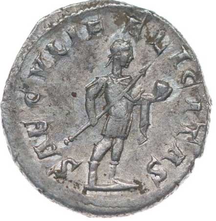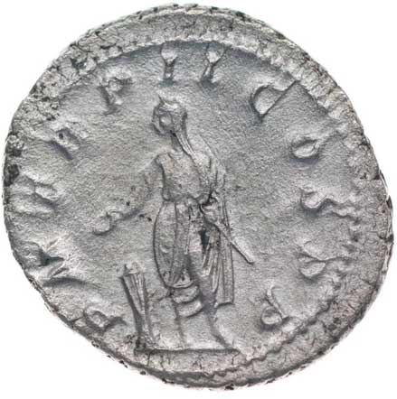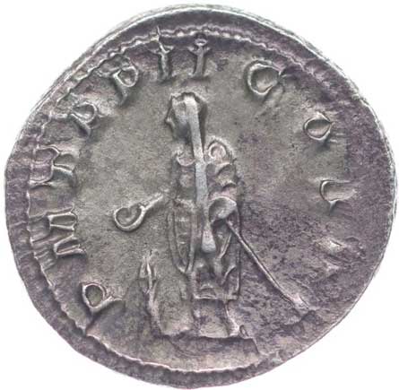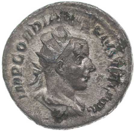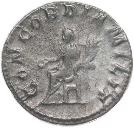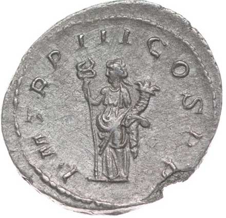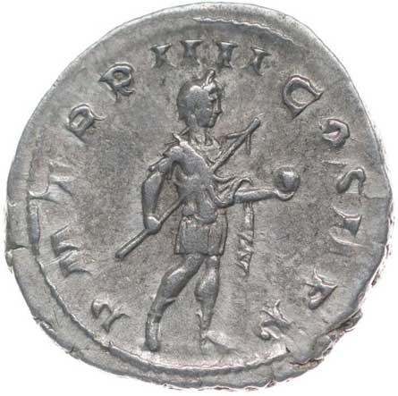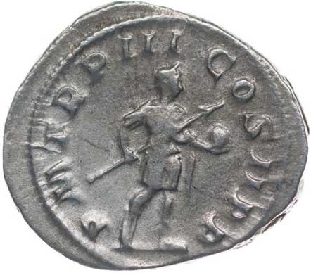 128. AR Antoninianus, Rv:"P.M.TR.P.III.COS.II.P.P.", stojící Gordianus